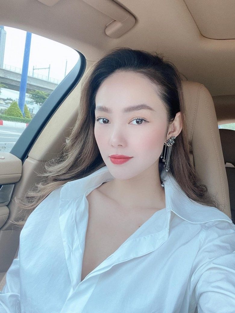 Qua rồi thời diện áo sơ mi thùng thình, Minh Hằng chọn kiểu áo sơ mi ôm, khoe vóc dáng thon gọn, "mỏng dính".