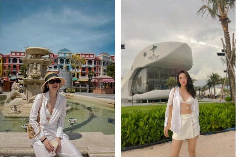 "Bé Heo" cũng tận dụng những chiếc áo sơ mi dùng làm áo khoác, bên trong cô diện bikini nóng bỏng. Cách kết hợp này vừa kín đáo khi không phô phang quá nhiều nhưng vẫn tạo cảm giác gợi cảm.