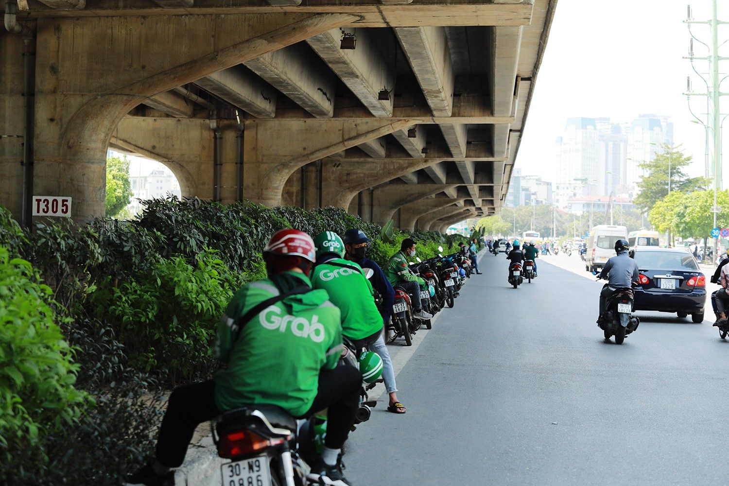 Nhiều tài xế xe ôm công nghệ đỗ xe dưới lòng đường Phạm Hùng để tránh nắng