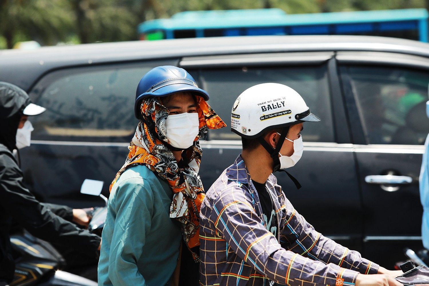 Giữa trưa, trời nóng hầm hập khiến người tham gia giao thông rất vất vả, ngoài tìm đủ mọi cách như dùng áo chống nắng, khăn, mũ, khẩu trang… để chống nóng, họ còn phải tránh đứng sau những xe ô tô phả hơi nóng khi dừng chờ đèn đỏ.