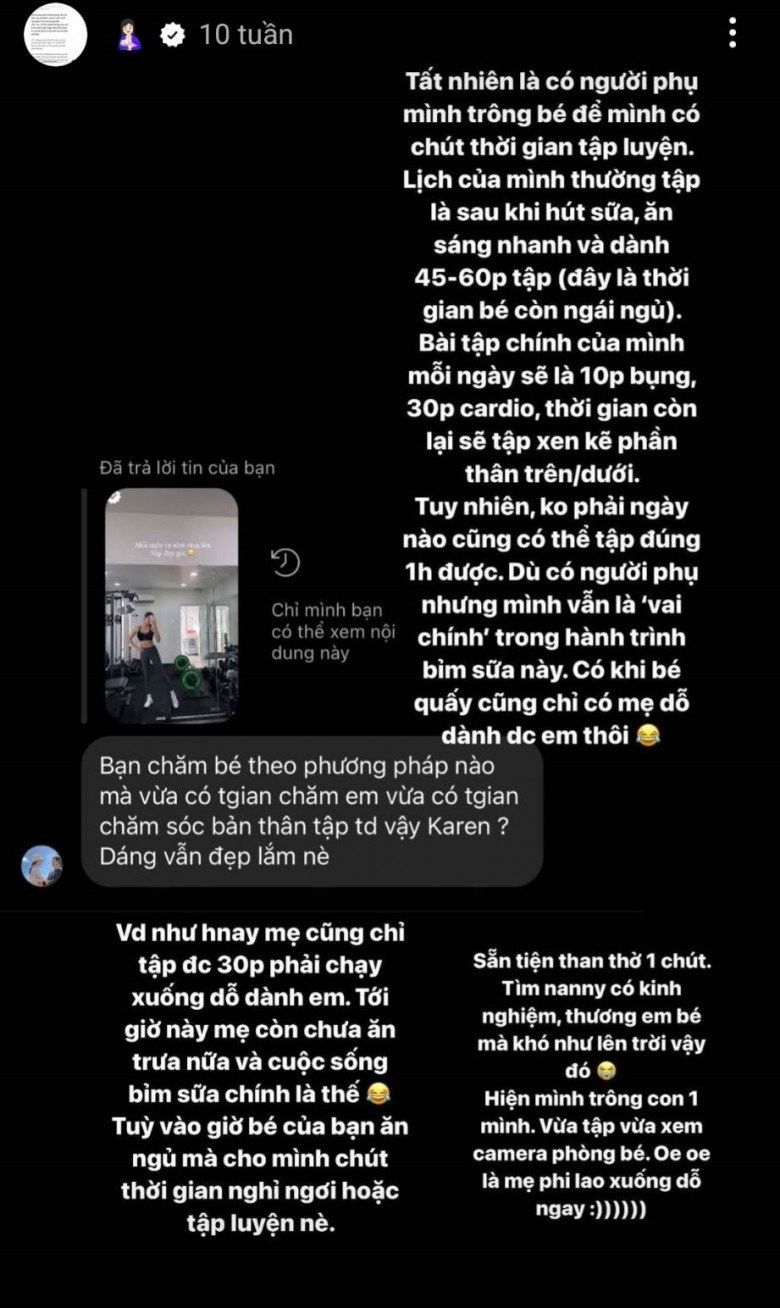 Nữ diễn viên đã kết hợp tập luyện sau sinh nhưng vừa tập vừa phải chăm con khi có lúc phải trông con một mình: "Vừa tập vừa xem camera phòng bé. Oe oe là mẹ phi lao xuống dỗ ngay".
