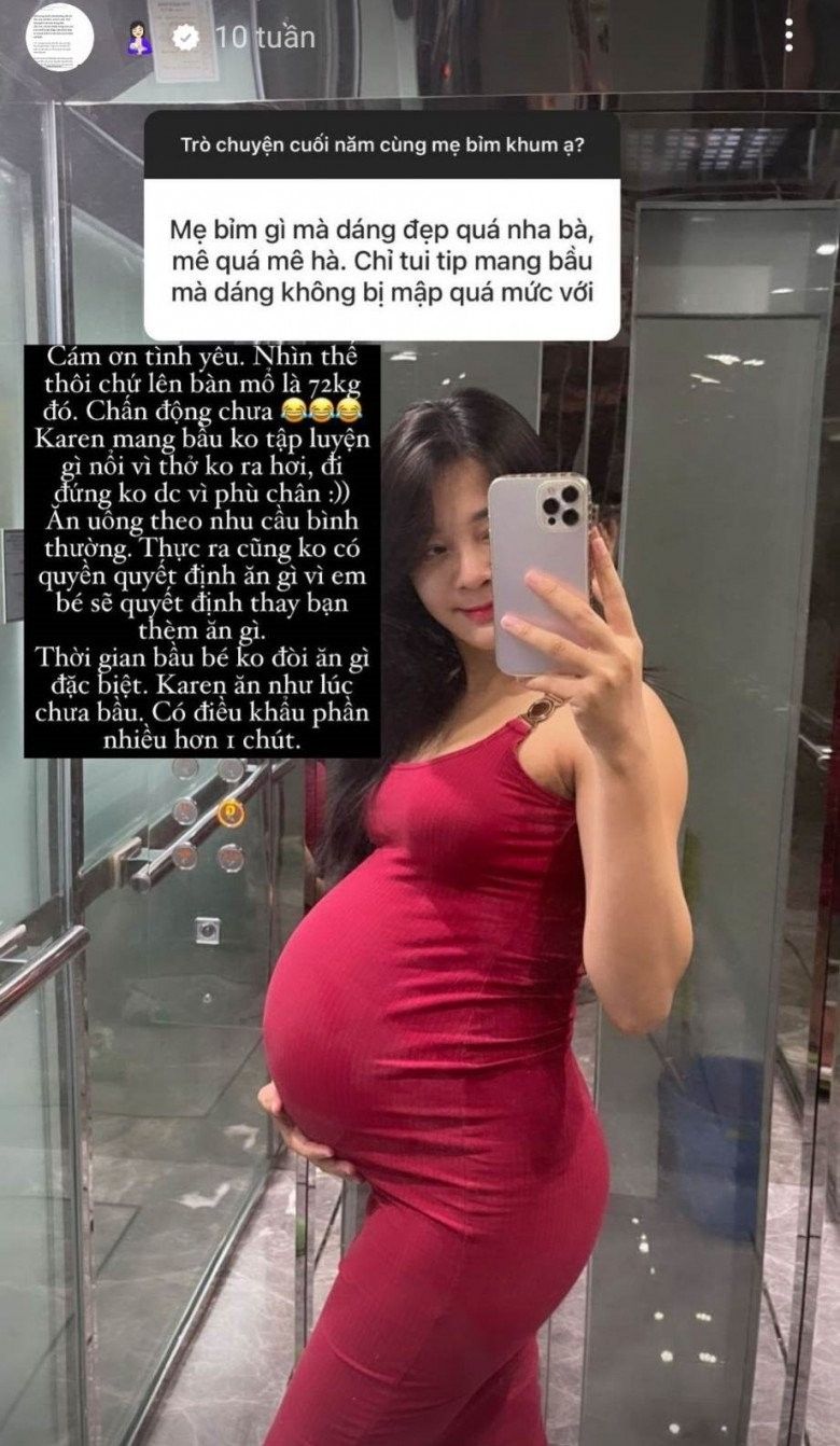Trước đó, khi mang bầu cô cũng hay nhận được câu hỏi từ người hâm mộ về quá trình bầu bí. Nữ diễn viên cho biết lúc mang thai cô lên tận 25kg.