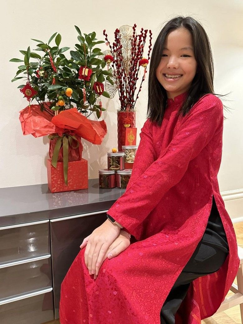 Vân Anh cho con mặc áo dài, gửi lời chúc tết đến mọi người để con không quên đi nguồn cội.