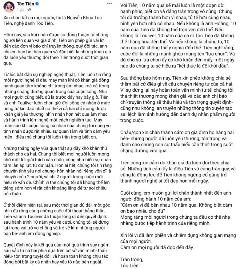 Trưa 17/11, Tóc Tiên xác nhận thông báo ly hôn Hoàng Touliver sau 10 năm đồng hành và 5 năm làm vợ chồng. Cô cho biết sau thời gian suy xét, cả 2 quyết định kết thúc hành trình làm vợ chồng, trở lại làm bạn bè, đồng nghiệp. Nữ ca sĩ khẳng định kết quả này dựa trên cơ sở văn minh - thấu hiểu - tôn trọng, không chịu tác động bởi cá nhân hay yếu tố nào bên ngoài.