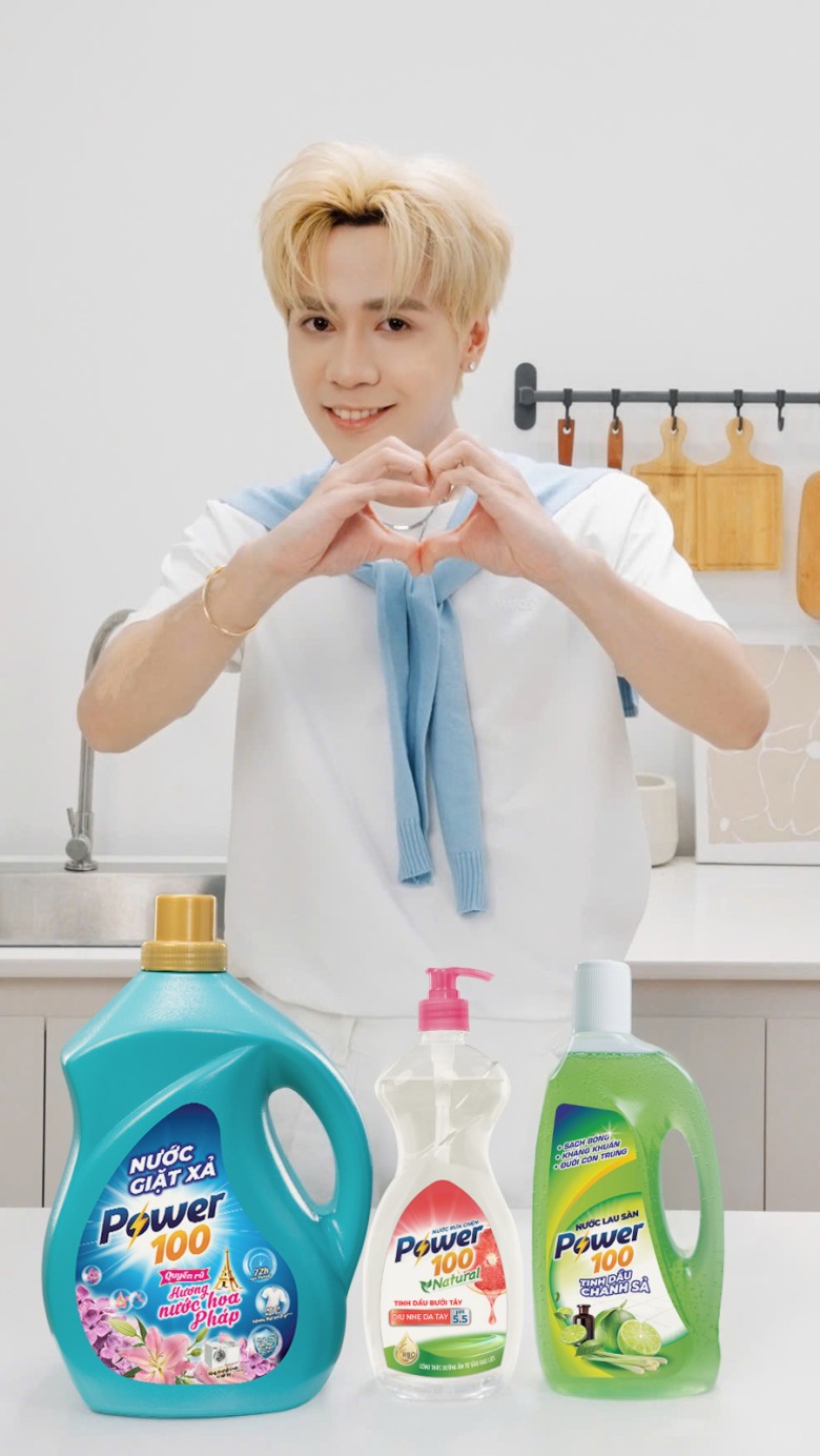 Để minh chứng cho tinh thần chuẩn “trai đảm trăm điểm”, Quang Hùng MasterD đã xắn tay vào làm việc nhà theo cách của riêng “tổng tài”. Anh không xem đây là nghĩa vụ mà thực sự tận hưởng từng khoảnh khắc khi anh biến chai nước rửa chén Power100 Natural thành chiếc micro để phiêu theo nhạc, hay chăm chú đổ nước giặt vào máy, tất cả đều cho thấy anh đang dồn tâm ý vào đó, không khác gì cách anh thả hồn vào âm nhạc. Quang Hùng MasterD chứng minh mình không chỉ là một “tổng tài” trên sân khấu, mà còn là một “trai đảm trăm điểm” thực thụ trong cuộc sống.