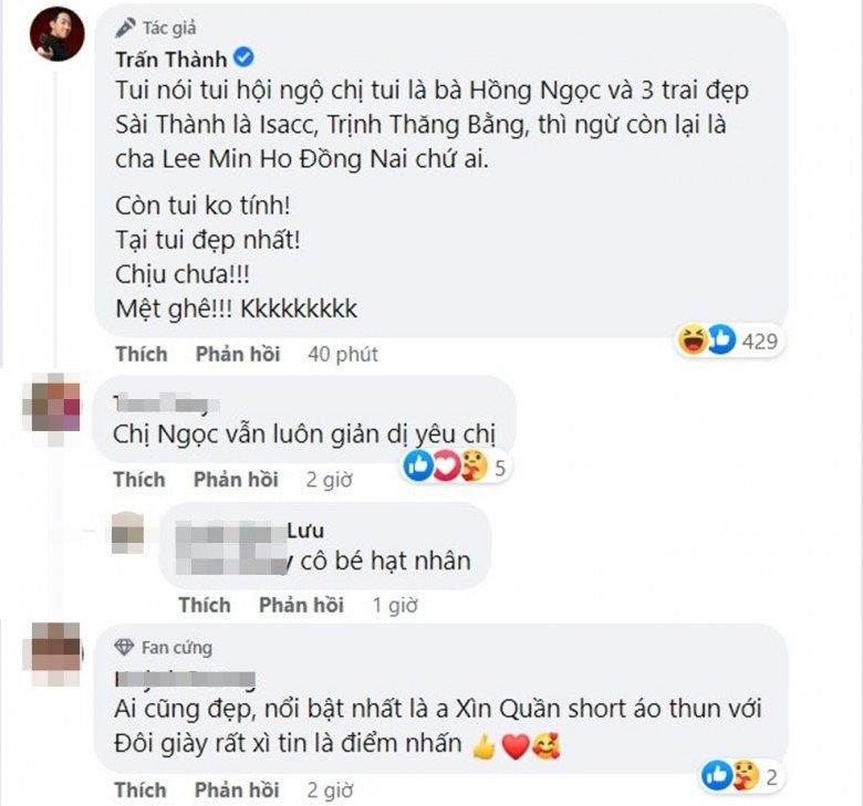 Trấn Thành còn dí dỏm không nhận mình trong chú thích là "3 trai đẹp", anh nhận mình đẹp nhất. Không cần nói ra nhiều người cũng hiểu rằng, anh đẹp nhất vì phong cách độc đáo là quần shorts, áo thun với đôi giày không "đụng hàng".