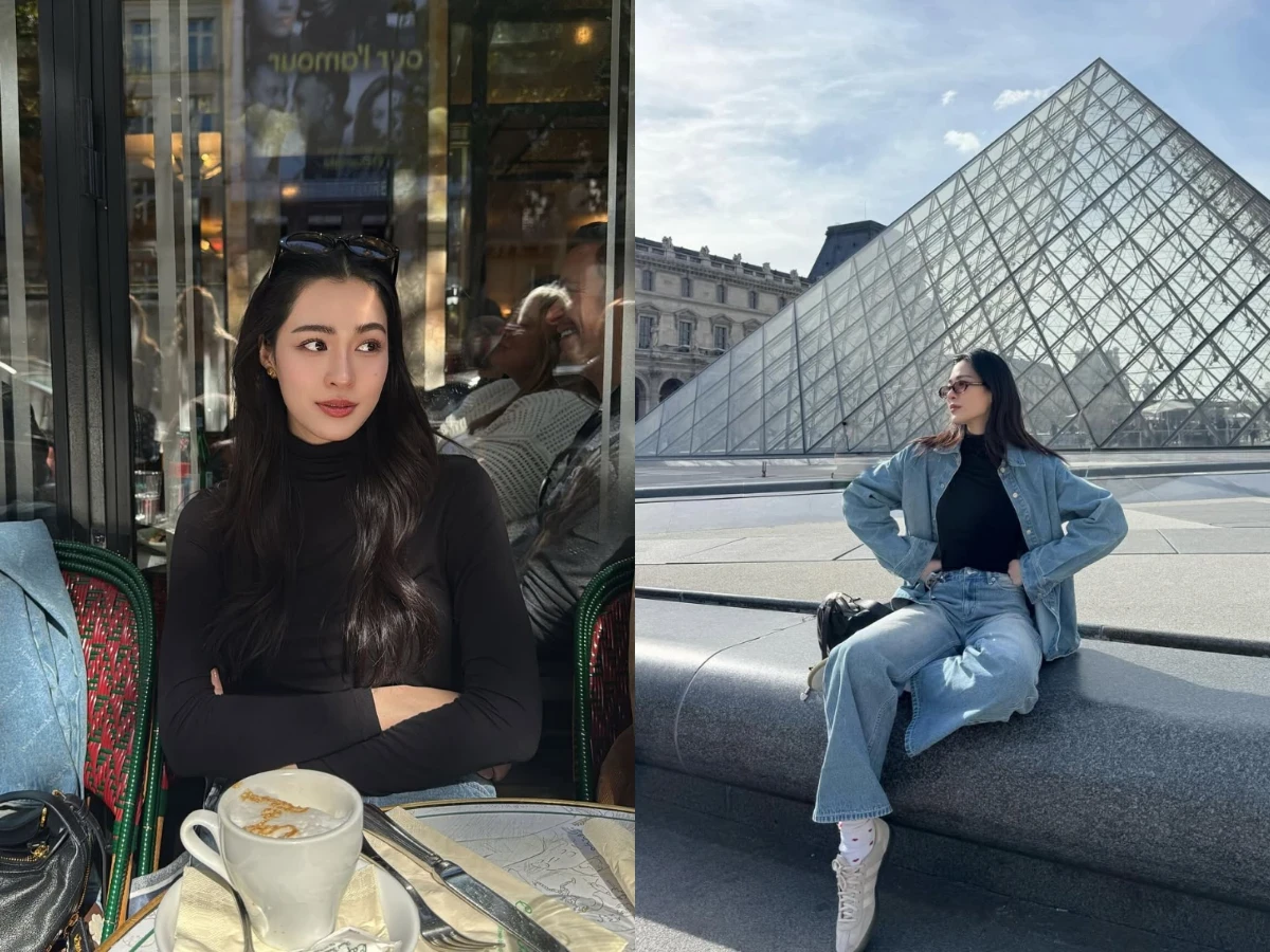 Nữ diễn viên Thái Lan gốc Hồng Kông Sirilak Kwong mang đến cách phối đồ nhẹ nhàng hơn với áo cổ lọ đen. Thiết kế vốn tối giản và gọn gàng này khi kết hợp cùng áo khoác denim lập tức tạo cảm giác thoải mái, phóng khoáng. Ngay cả khi không thêm phụ kiện, sự hài hòa của các mảng màu lớn vẫn đủ tạo nên diện mạo cuốn hút.