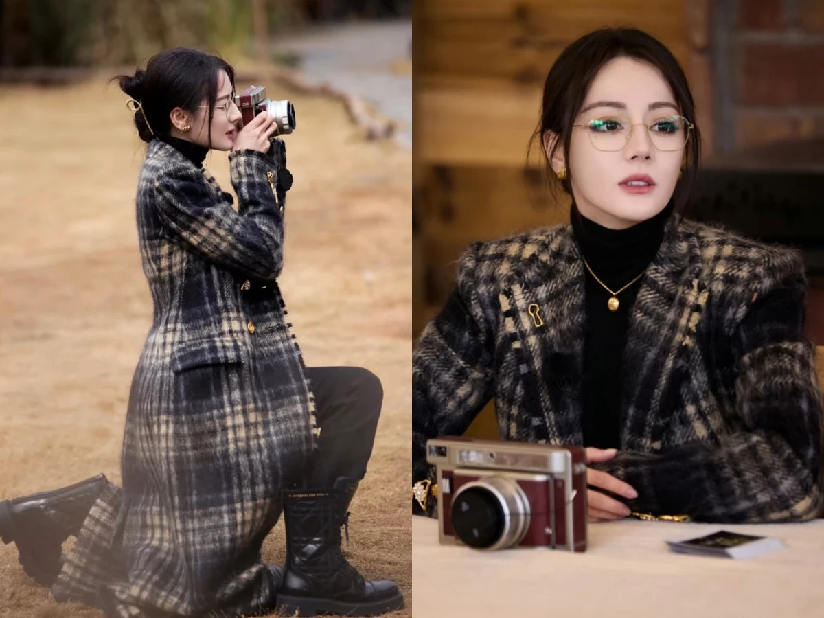 Địch Lệ Nhiệt Ba chọn áo cổ lọ đen mặc bên trong, khoác ngoài là áo khoác dài kẻ caro vừa thiết thực vừa tôn dáng. Cô khéo léo nhấn nhá phụ kiện vàng để tăng điểm sang trọng, đồng thời kẹp gọn tóc nhằm khoe trọn phần cổ. Kính gọng vàng được phối ton sur ton với họa tiết caro của áo khoác, hoàn thiện tổng thể trí thức, thanh lịch và đầy cuốn hút.