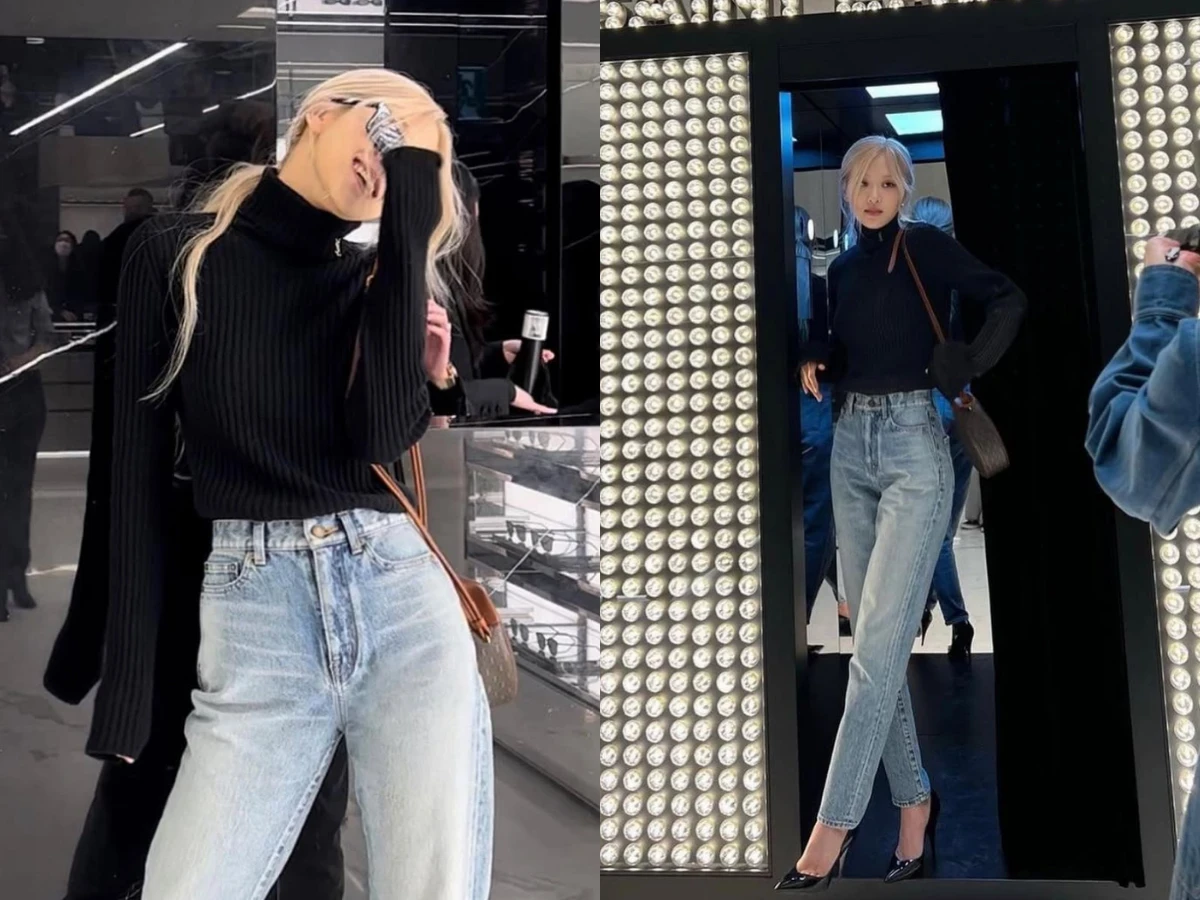 Rosé ghi điểm với set đồ tối giản nhưng đầy tinh tế: áo cổ lọ đen dệt kim dày dặn kết hợp cùng quần jeans cạp cao và giày cao gót, vừa thanh lịch vừa tôn dáng. Mái tóc dài được buộc đuôi ngựa thấp mang hơi hướng lãng mạn, trong khi chiếc túi xách nổi bật đóng vai trò điểm nhấn, hoàn thiện tổng thể gọn gàng, sành điệu và rất thời thượng.