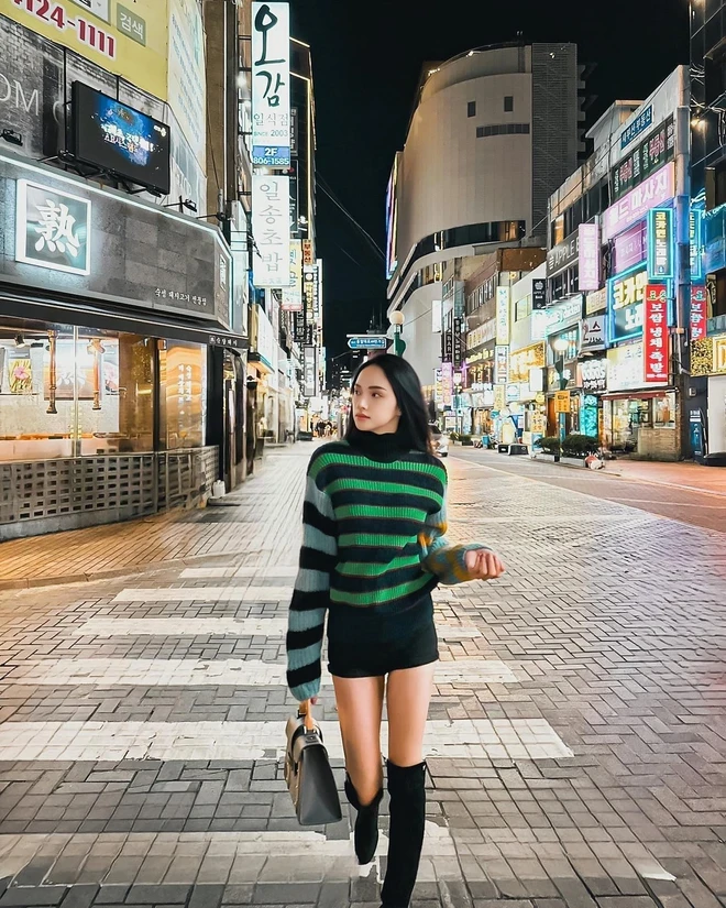 Hoa hậu Hương Giang có một cách biến tấu trẻ trung và năng động khi diện áo len cổ đen với áo len sọc màu bên ngoài. Dáng áo ôm vừa phải kết hợp cùng quần short ngắn và boots cao cổ mang lại cảm giác phóng khoáng, hiện đại. Set đồ phát huy tối đa sự tương phản giữa sắc đen nền nã và họa tiết nổi bật, lý tưởng cho phong cách street style mùa lạnh.