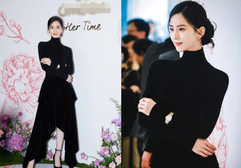 Lưu Thi Thi chọn áo cổ lọ đen ôm vừa phải, đường nét gọn gàng, tạo hiệu ứng liền mạch khi kết hợp cùng chân váy dài xẻ bất đối xứng. Điểm then chốt của set đồ nằm ở “tỷ lệ cổ”: cô búi tóc cao hoặc buộc gọn ra sau để lộ phần cổ và xương quai xanh, giúp tổng thể thanh thoát hơn. Khuyên tai vàng và đồng hồ tối giản được sử dụng vừa đủ, giữ vẻ kín đáo nhưng vẫn sang trọng.