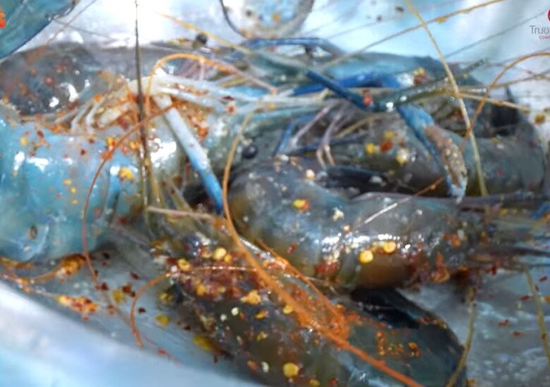 Những chú tôm càng xanh được ướp muối ớt đậm đà trước khi đem nướng muối ớt, sau đó nướng trên bếp than hồng.