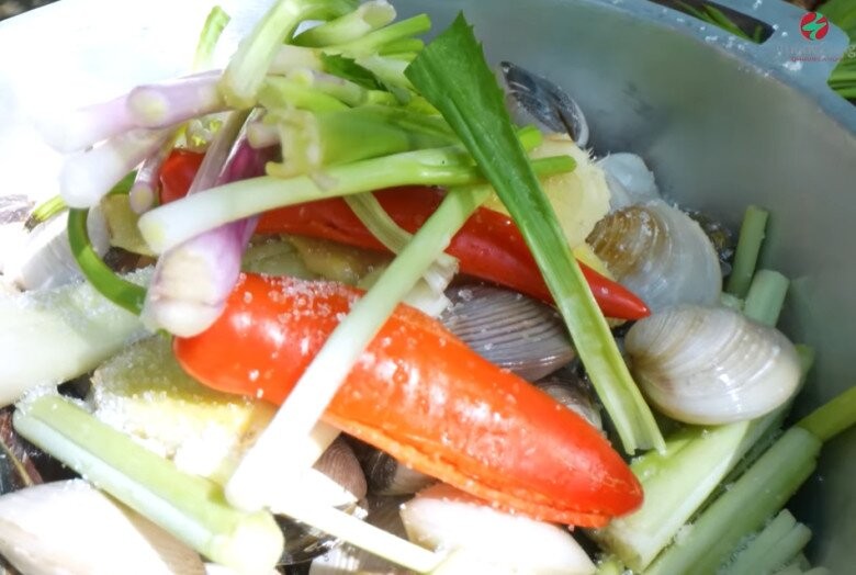 Nồi nghêu xông hơi sôi nghi ngút, tỏa mùi thơm hấp dẫn của các loại gia vị.