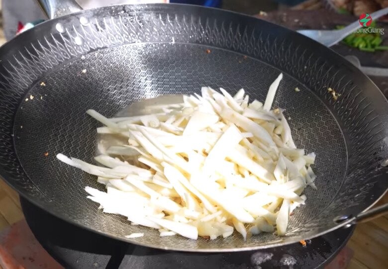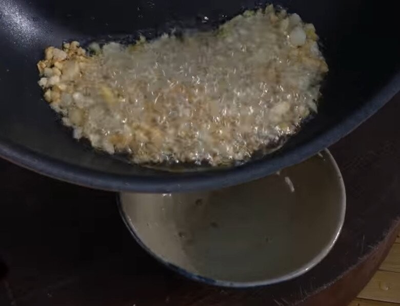 Nam danh hài bắt đầu chế biến. Công đoạn phi tỏi vàng ruộm, tỏa mùi thơm nức mũi trong chảo nóng.
