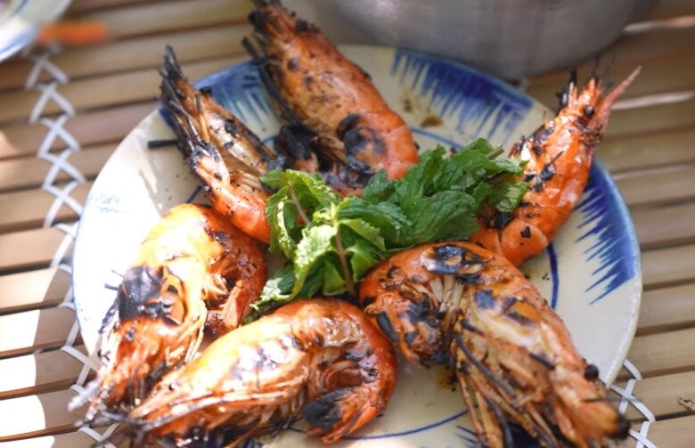 Tôm nướng đã gần xong, cháy cạnh thơm lừng đúng kiểu dân dã miền Tây.