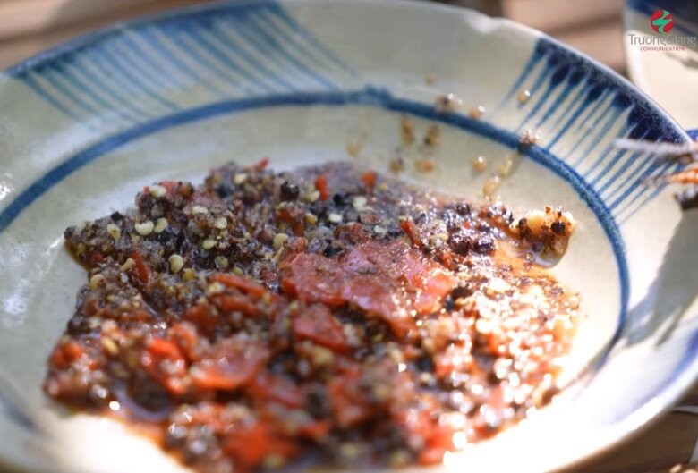 Tôm nướng ăn kèm với chén muối ớt tiêu cay nồng đặc trưng miền Tây. Trường Giang gọi là tôm "bóng đêm" do Tiêu Minh Phụng nướng.