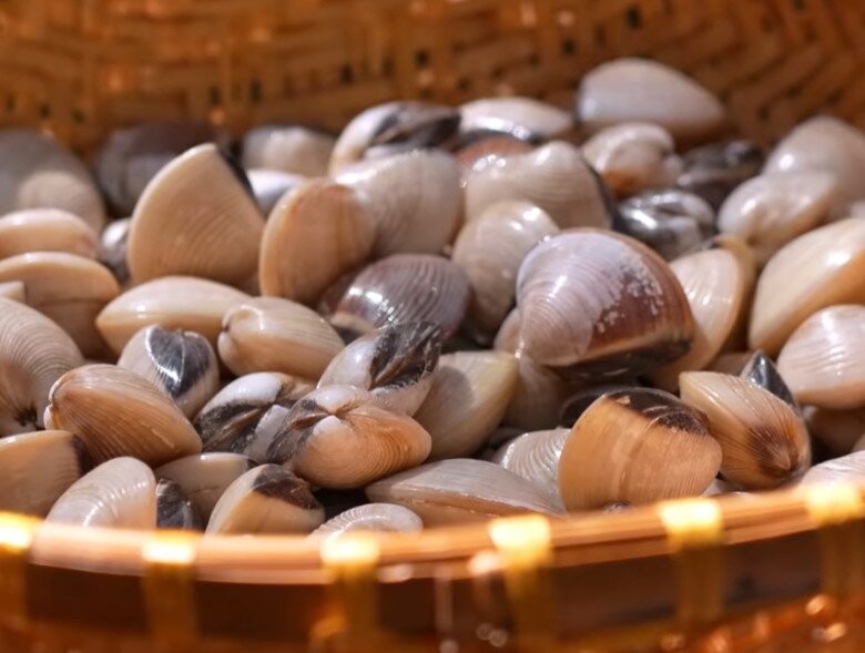Rổ nghêu trắng sạch sau khi được thu hoạch và sơ chế kỹ lưỡng.