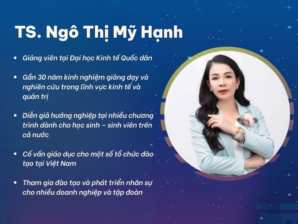 Với 28 năm kinh nghiệm giảng dạy - nghiên cứu tại Đại học Kinh tế Quốc dân và làm diễn giả cho hàng trăm chương trình hướng nghiệp tại các trường THPT, trường Đại học, TS.Ngô Thị Mỹ Hạnh đã đồng hành cùng hàng trăm ngàn học sinh, sinh viên và phụ huynh trong việc định hướng nghề nghiệp, lựa chọn ngành học và xây dựng kế hoạch học tập, phát triển bản thân.
