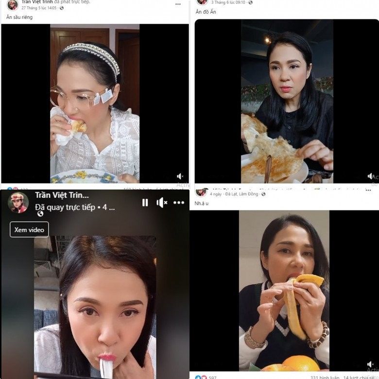 Trang cá nhân của Việt Trinh giờ lúc nào cũng thấy cô trong tình trạng livestream và ăn một cái gì đó, khi là bún phở, khi là sầu riêng, chuối, bánh,...