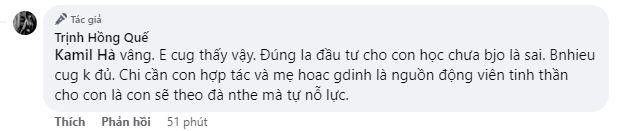 Trước thành tích của ái nữ, Hồng Quế rất hào phóng trao thưởng: "Chiều nay tan học phải thưởng cho 200k nhét lợn". Bên dưới bài viết, rất nhiều người gửi lời chúc mừng 2 mẹ con Hồng Quế. Thậm chí còn có người quen có ý định gửi con sang nhà Hồng Quế nhờ cô kèm giúp.