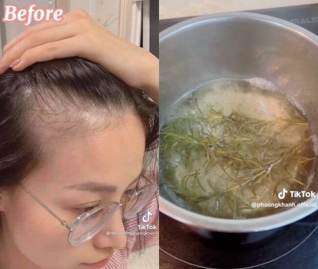 Phương Khánh đun lá hương thảo với nước, để nguội rồi cho vào chai xịt dùng dần. Mỗi lần sử dụng, cô xịt trực tiếp lên chân tóc, massage nhẹ nhàng và ủ trong khoảng 1-2 tiếng trước khi gội lại như bình thường.