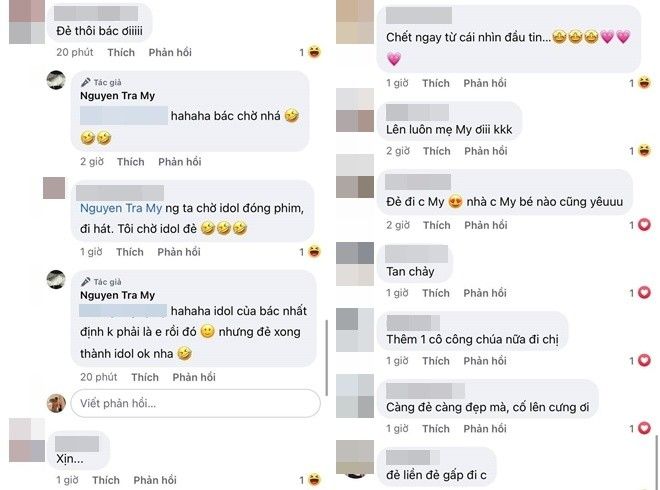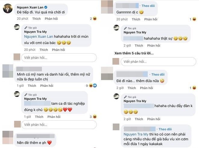 "Mình có mỹ nam và danh hài rồi, thêm mỹ nữ nữa là đẹp luôn chị", "Nên đẻ thêm em ạ", "Đẻ đi nào, thêm đứa nữa", "Đẻ thôi bác ơi", "Đẻ tiếp đi. Vui quá mà chời ơi", "Càng đẻ càng đẹp mà, cố lên cưng ơi"… là những bình luận ủng hộ cô.