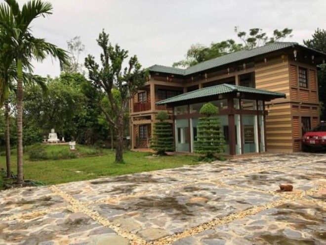 Toàn cảnh khu nhà chia làm hai khối với phía ngoài là không gian mở với phần cửa kính nhìn thẳng ra vườn. Phía phần sân rộng rãi đủ sức chứa nhiều xe ô tô mỗi khi đón khách đến chơi nhà. Ngoài khu nhà chính, ngôi nhà còn có một khoảng riêng đặt tượng Phật để chủ nhà có thể ngồi thiền tĩnh tâm dưới gốc cây bồ đề.