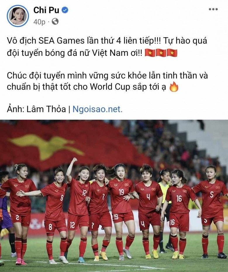 Đang bận lịch quay show tại Trung Quốc, Chi Pu vẫn gửi lời chúc mừng trước chiến thắng rầm rộ của tuyển bóng đá nữ nước nhà. "Vô địch SEA Games lần thứ 4 liên tiếp! Tự hào quá Đội tuyển bóng đá nữ Việt Nam ơi! Chúc đội tuyển mình vững sức khỏe lẫn tinh thần, chuẩn bị thật tốt cho World Cup sắp tới ạ", cô bày tỏ niềm tự hào.