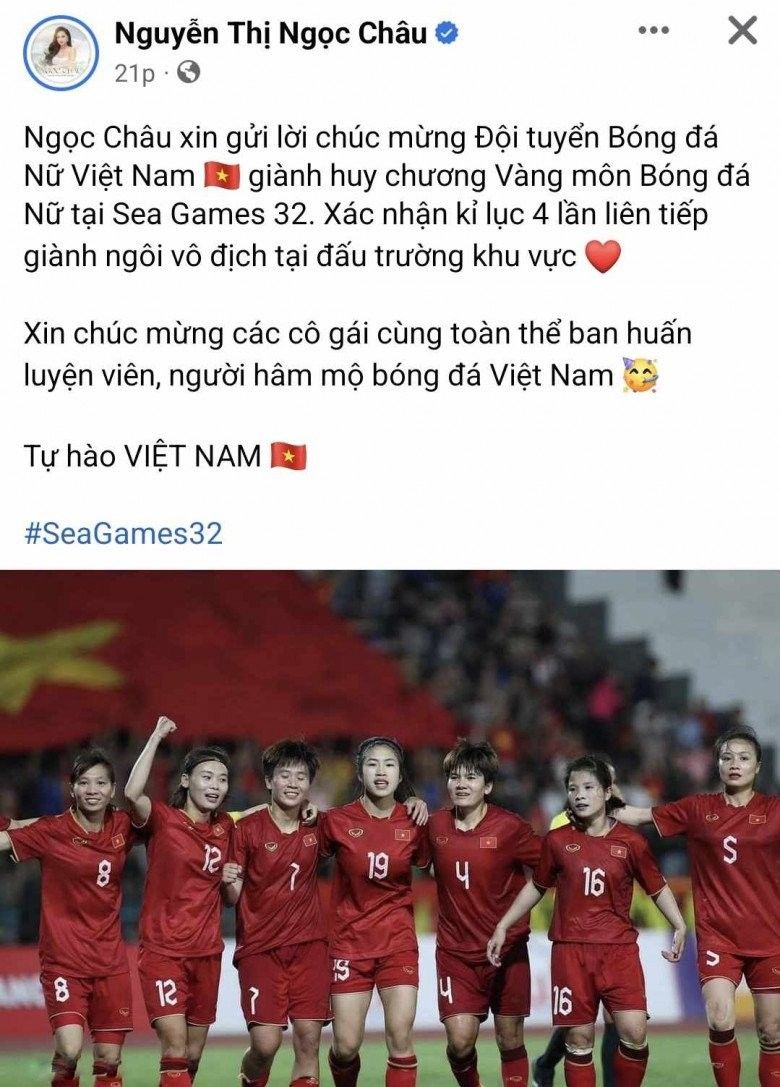Hoa hậu Ngọc Châu cũng đã đăng tải bài viết chúc mừng trên trang cá nhân. Nàng Hậu viết: "Ngọc Châu xin gửi lời chúc mừng Đội tuyển bóng đá nữ Việt Nam giành Huy chương Vàng môn Bóng đá nữ tại SEA Games 32. Xác nhận kỷ lục 4 lần liên tiếp giành ngôi vô địch tại đấu trường khu vực. Xin chúc mừng các cô gái cùng toàn thể ban huấn luyện viên, người hâm mộ bóng đá Việt Nam. Tự hào Việt Nam".