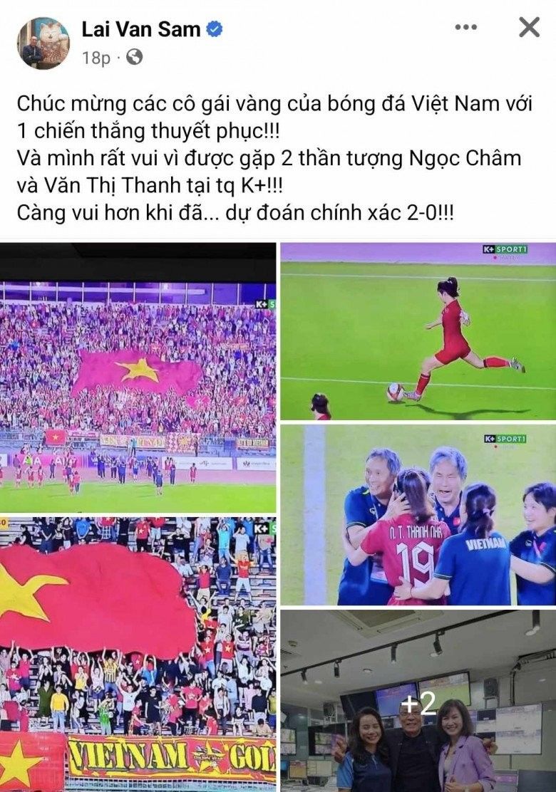 Tham gia chương trình bình luận bóng đá SEA Games 32, nhà báo/BTV Lại Văn Sâm chia sẻ hình ảnh "nóng cùng SEA Games" ngay tại trường quay. "Chúc mừng các cô gái vàng của bóng đá Việt Nam với chiến thắng thuyết phục! Và mình rất vui vì được gặp 2 thần tượng Ngọc Châm và Văn Thị Thanh. Càng vui hơn khi đã... dự đoán chính xác 2-0!", Lại Văn Sâm phấn khởi chia sẻ.