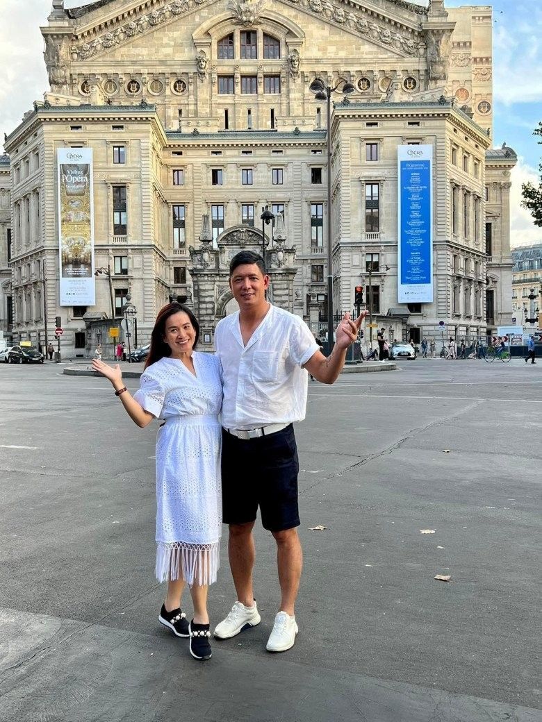 Bình Minh và Anh Thơ ăn mặc sành điệu dự tiệc tại Pháp.