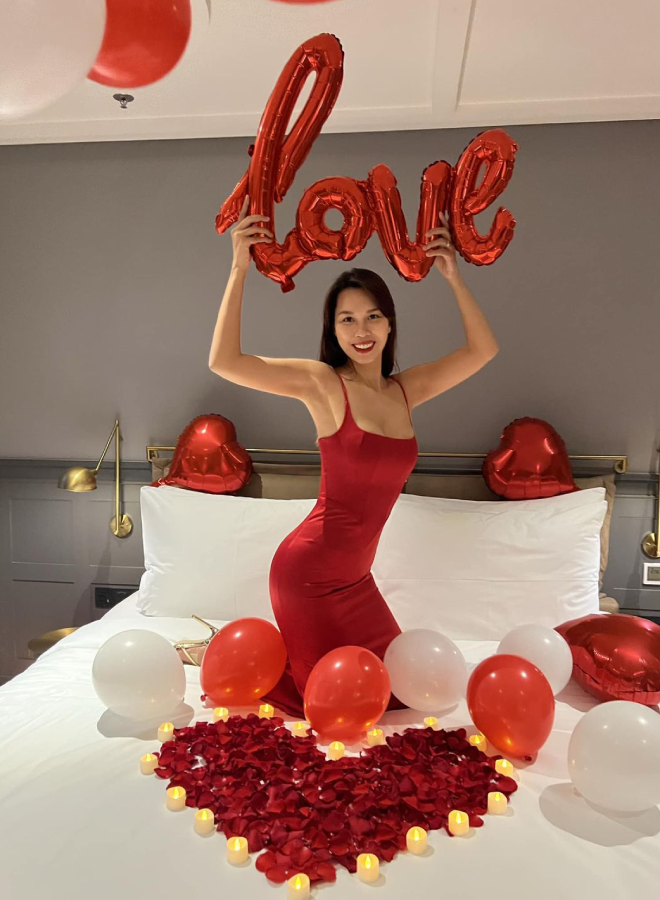 Diễn viên Bình An và Á hậu Phương Nga chụp ảnh kỷ niệm mừng năm đầu tiên đón Valentine với tư cách vợ chồng.