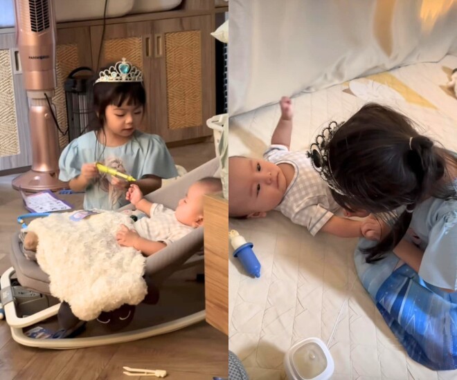 "Mỗi lần đi học về, chưa kịp thưa mẹ thưa ba thì 3 bé đã chạy vào nhà 'thưa em' trước rồi. Các con hôn em, rồi chơi với em. Còn chị Hai Queenie thì khỏi nói, rất ngoan, rất biết chuyện. Bé không chỉ thương em út mà còn thương cả 2 em gái song sinh dù 2 em quậy lắm, cứ giành của chị mà chị vẫn nhường", nữ diễn viên kể.