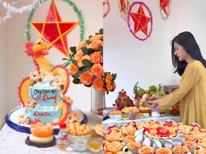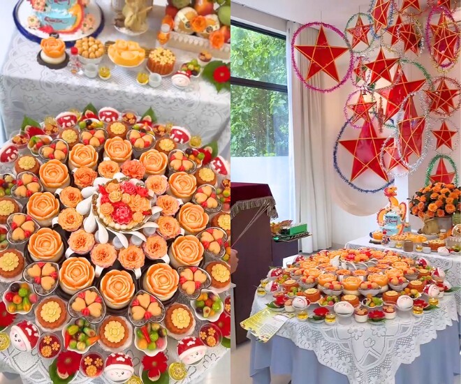 Sao phim Dù gió có thổi chia sẻ: "Tính theo ngày âm lịch thì Tin đã tròn 1 tuổi rồi. Đợt này mâm cúng mẹ chọn tông màu vàng, cam, đỏ cho nó rực rỡ để đón Trung thu luôn. Và quan trọng hơn hết là hợp mệnh của em Tin".