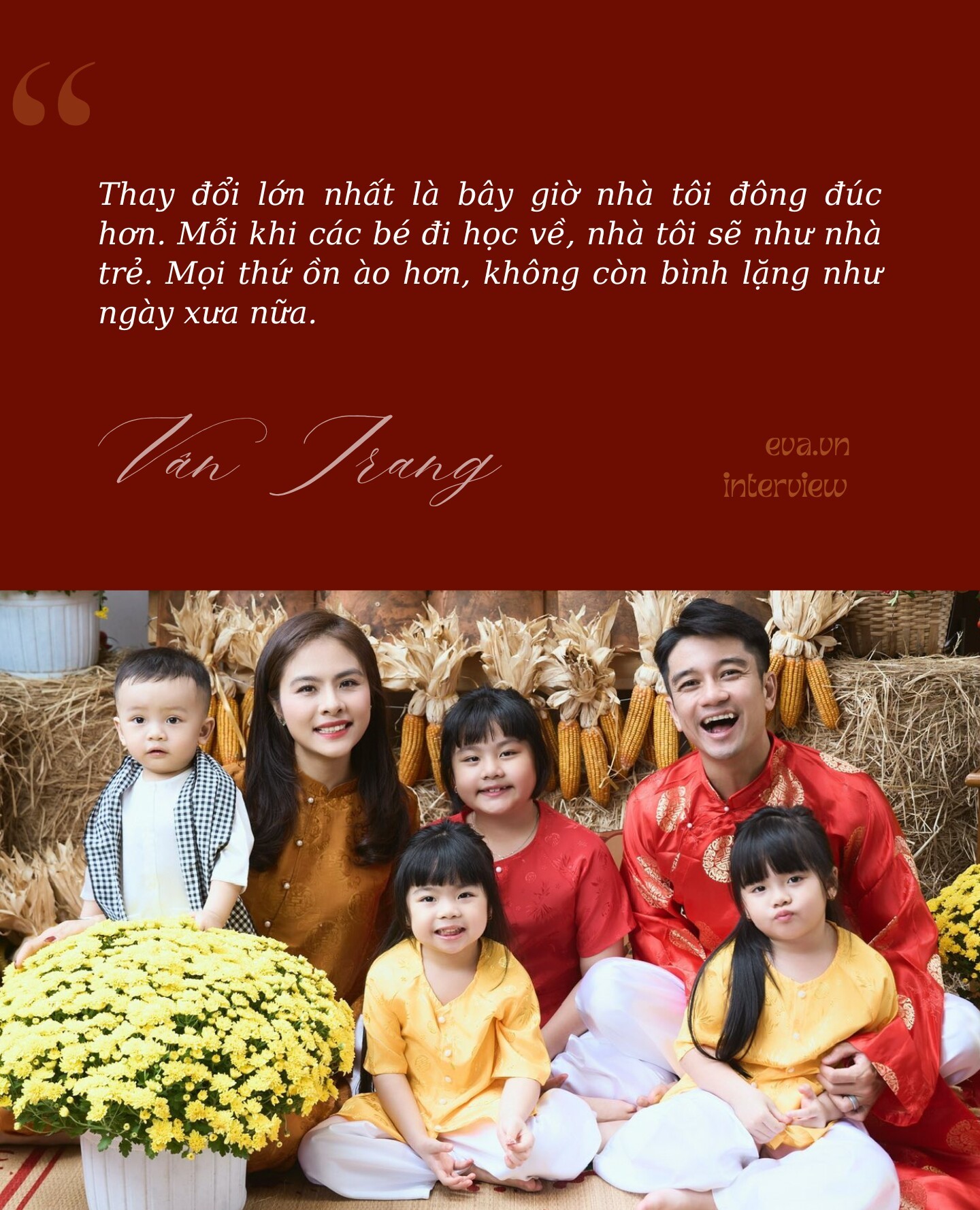 Tôi cảm thấy cuộc đời của mình khá bình an, mọi thứ đến đều hạnh phúc nên tôi chỉ biết ơn thôi chứ không muốn thay đổi điều gì. Thành tựu lớn nhất của tôi trong năm vừa qua là đón cái Tết đầu tiên ở nhà mới và có thêm bé út.