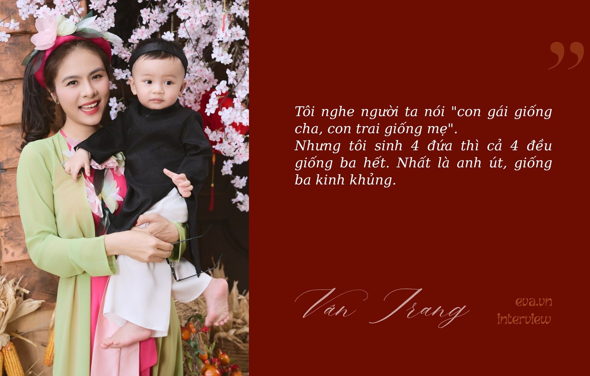 Nhưng tôi sinh 4 đứa thì cả 4 đều giống ba hết. Nhất là anh út, giống ba kinh khủng. Nhưng không sao, giống mà đẹp trai, nhìn khôi ngô tuấn tú là được. Cũng may mắn là em Tin trông cũng dễ thương và rất hay cười. Từ khi sinh ra, Tin đã rất dễ chịu. Chắc con biết mình "sinh sau đẻ muộn", nếu không dễ chịu thì không ai lo cho.