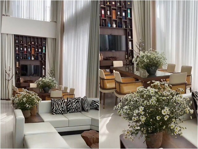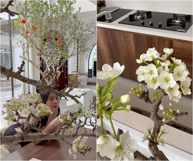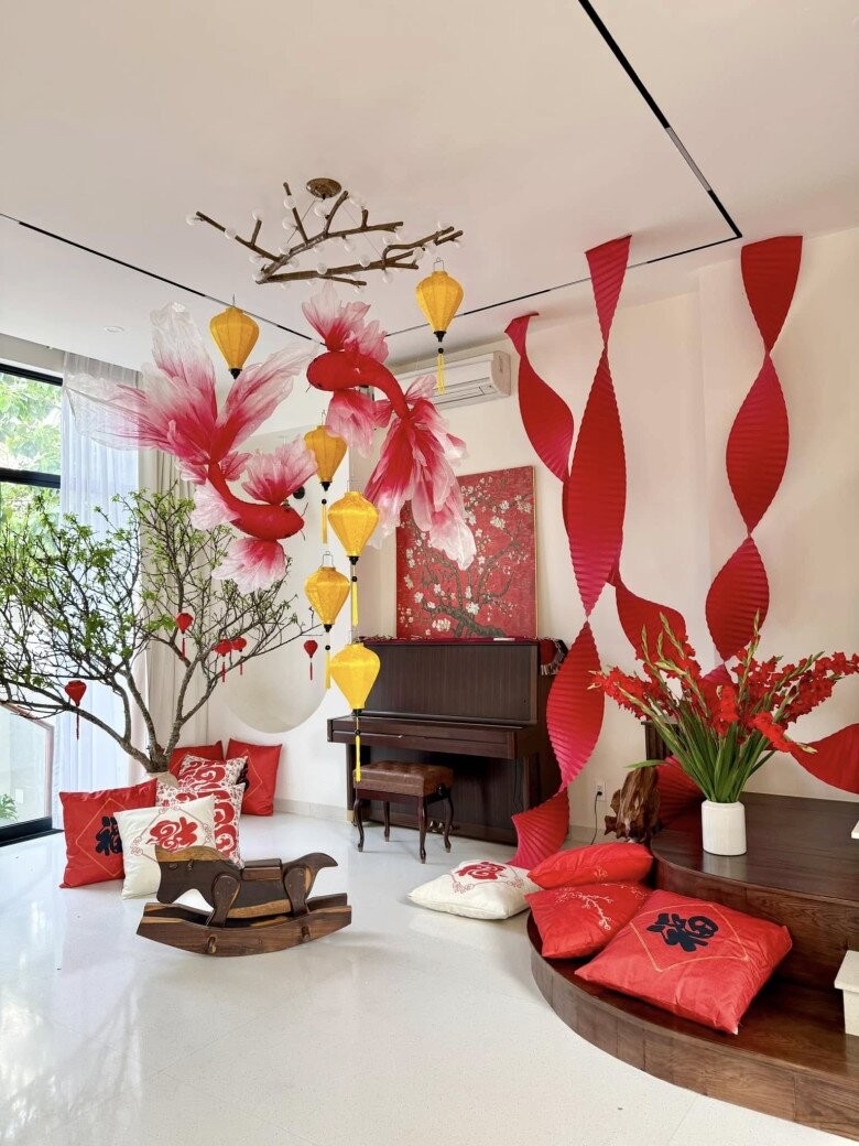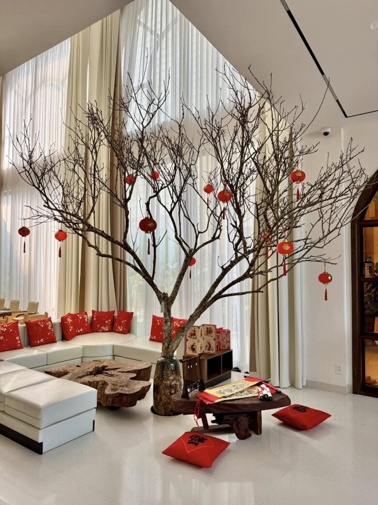 Những dịp lễ Tết, căn biệt thự của Vân Trang thêm đầy sức sống, rực rỡ mà vẫn giữ nét tinh tế, truyền thống. Cô thường chọn cành lớn như đào, mai, lê, mận, đặt trong các bình gốm cao, tạo thế tỏa rộng, vươn cao. Không gian được điểm xuyết những bình hoa đỏ và các món decor đậm chất Á đông.