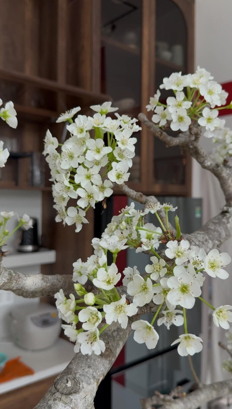 Bà mẹ 4 con hồi hộp ngắm "cành củi khô" từng ngày biến hình thành cành lê với những bông hoa trắng muốt. Cô hóm hỉnh rằng ngày đầu cắm trông "xấu thật, như cái tay bị cùi" nhưng những ngày sau hoa mọc lên từng chùm rất đẹp.