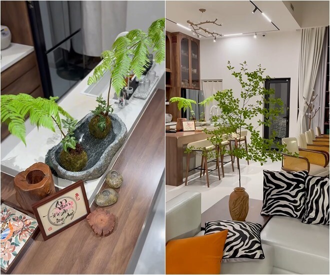 Diễn viên sinh năm 1990 dí dỏm rằng "đó giờ vẫn mê cây lá và vẫn sợ sâu". Từ tiểu cảnh rêu đá và dương xỉ mini đến cành thạch nam cho thấy thiên về cảm giác mộc mạc, thư giãn, rất “chơi” mà không phô trương.