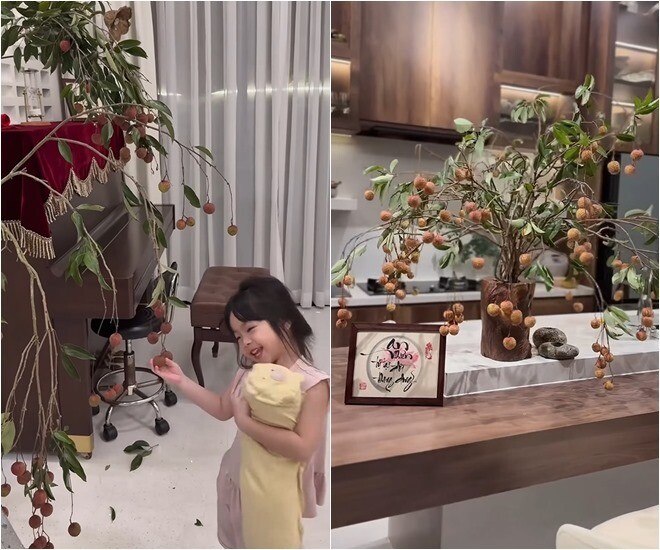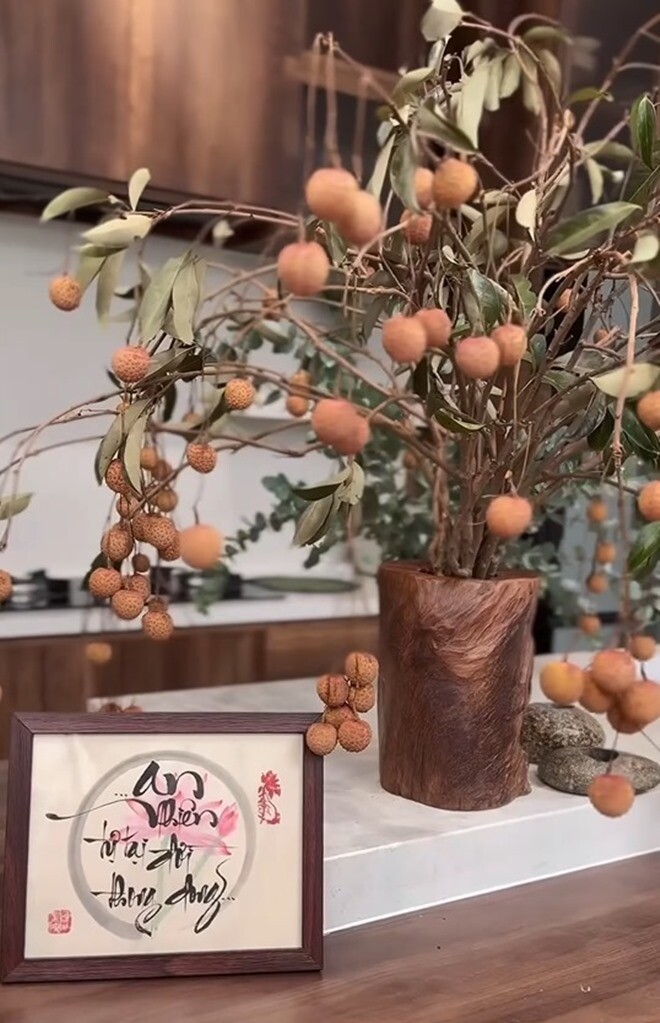 Những cành vải được tuốt bớt lá, để lộ quả lúc lỉu. Nữ diễn viên đã làm căn nhà trở nên sống động và đầy chất quê nhà giữa không gian sang trọng.