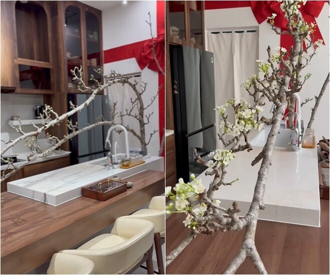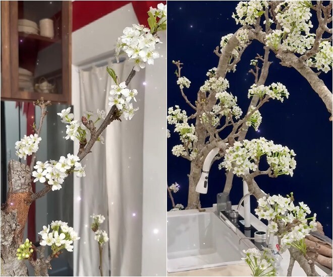 Cô không biết để đâu nên cắm trong đảo bếp. "Từ giây phút em nó nở hoa ra, lúc nào tôi cũng ở trong bếp và cứ xuýt xoa hoài, ngắm nó hoài, quay nó hoài", nữ diễn viên chia sẻ.
