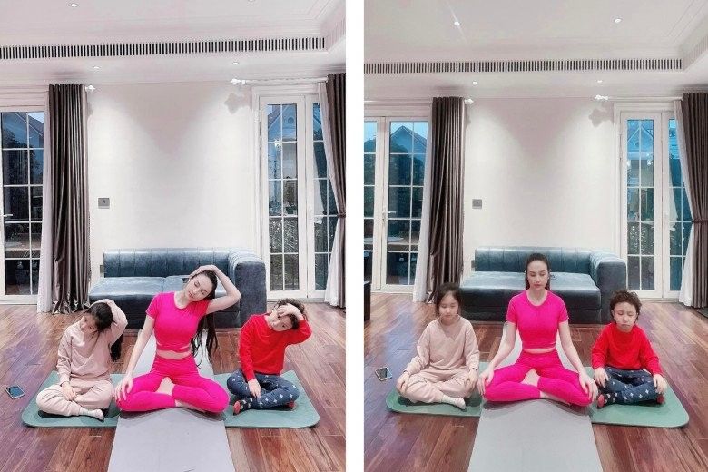 Bà xã Tuấn Hưng cũng bắt đầu cho các con tập luyện yoga cùng.