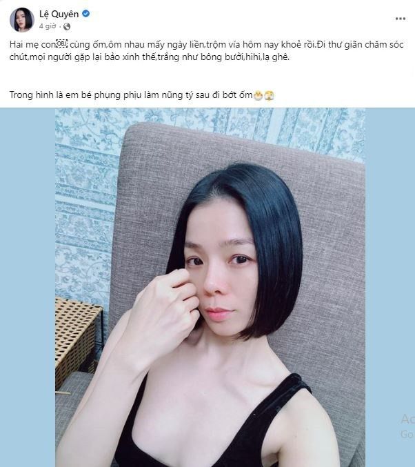 Theo đó thay vì xấu xí hay trông mệt mỏi, Lệ Quyên lại được khen ngợi xinh xắn hơn, da dẻ đẹp hơn. "Hai mẹ con cùng ốm, ôm nhau mấy ngày liền, trộm vía hôm nay khoẻ rồi. Đi thư giãn chăm sóc chút, mọi người gặp lại bảo xinh thế, trắng như bông bưởi, lạ ghê. Trong hình là em bé phụng phịu làm nũng tý sau đi bớt ốm" - nữ ca sĩ viết. Kèm theo đó là hình ảnh Lệ Quyên mặt mộc nhưng vẫn xinh đẹp, có nước da trắng nõn nà. Ai ai cũng phải công nhận điều đó.