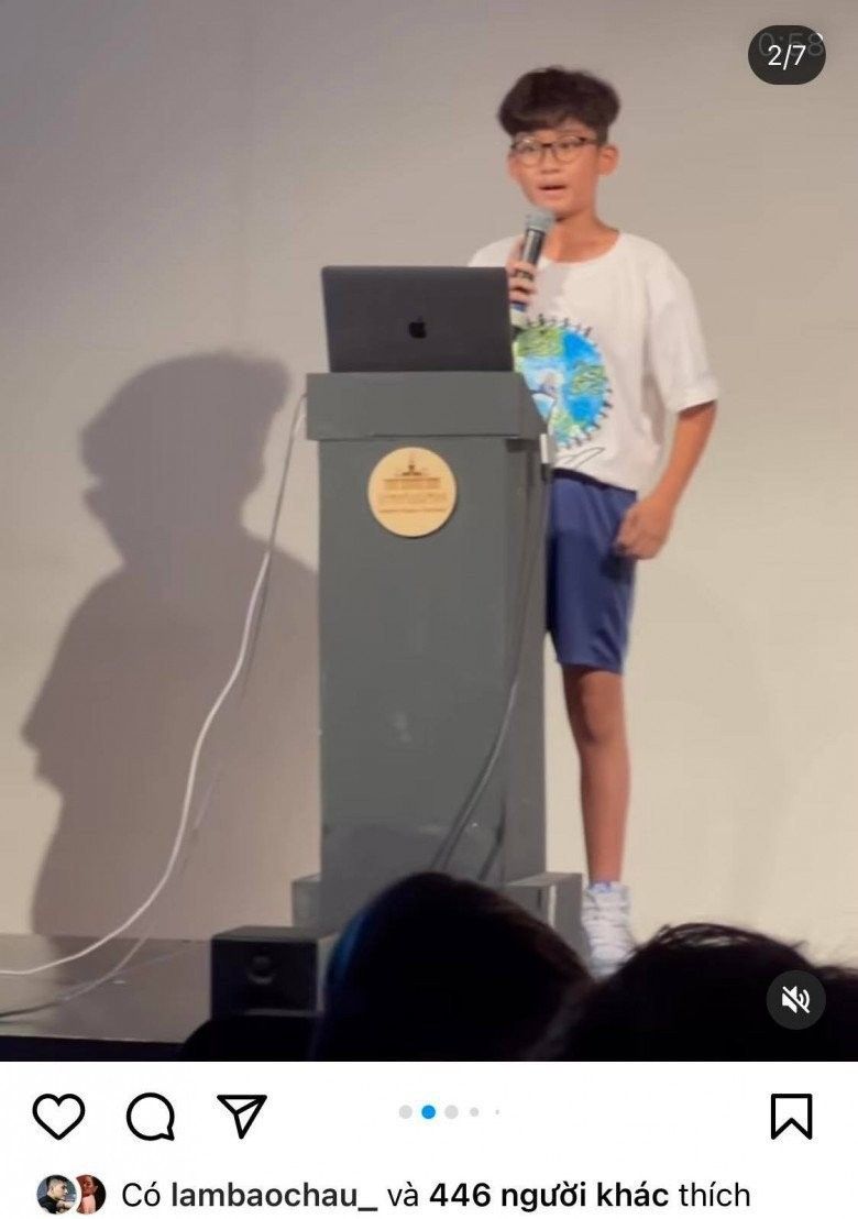 Con trai Lệ Quyết thuyết trình bằng tiếng Anh lưu loát.