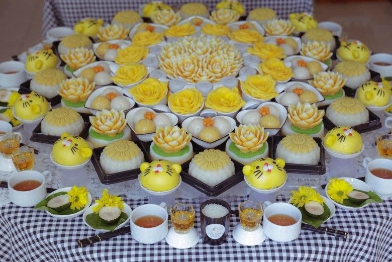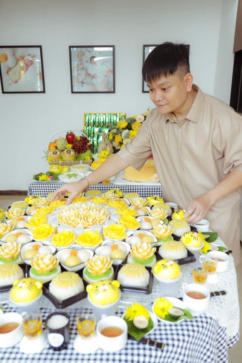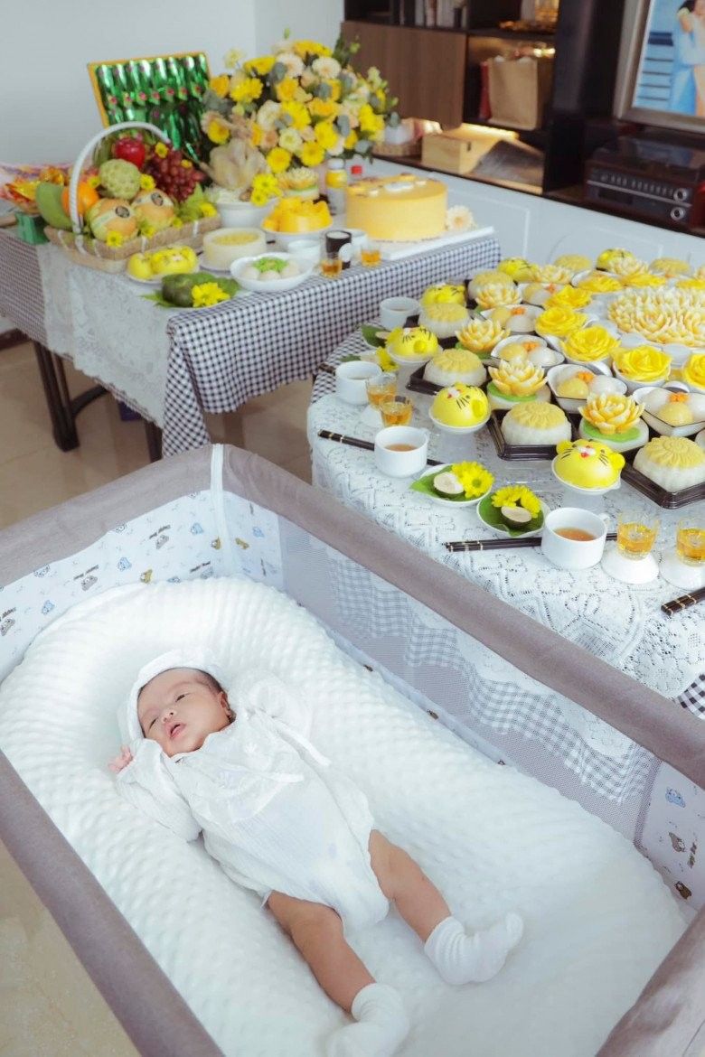 Những hình ảnh về tiệc đầy tháng của bé được nam đại gia bất động sản chia sẻ trên mạng xã hội đã thu hút sự chú ý của mọi người vì vô cùng xa hoa, đẹp mắt. Trịnh Tú Trung đã lấy màu vàng làm màu chủ đạo cho mâm cúng cùng những lễ vật quen thuộc không thể thiếu như gà luộc, giỏ quả, lẵng hoa, bánh gato, bánh bao, bánh thạch, xôi, chè, cau, bánh trôi...