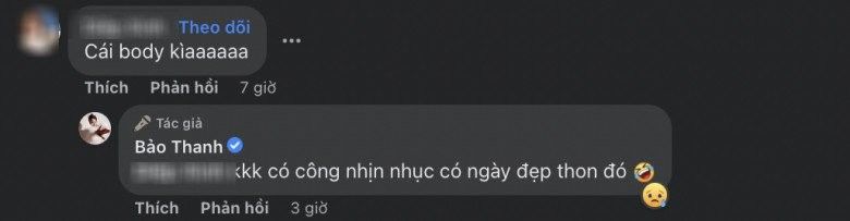 Khi được các fan khen ngợi về vóc dáng nuột nà sau sinh, Bảo Thanh hài hước chia sẻ bí quyết: "Có công nhịn nhục, có ngày đẹp thon".