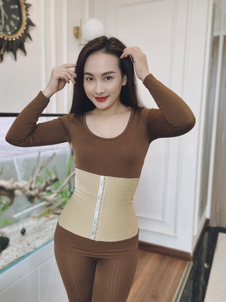 Ngoài ra, bà mẹ 2 con còn sử dụng đai latex để định hình lại thành bụng. Món đồ này tuy không có tác dụng trong việc giảm mỡ bụng nhưng lại kiến tạo nên thắt eo, vòng eo con kiến khá tốt. Chị em sau sinh lưu ý không đeo quá tối đa 10 tiếng 1 ngày.