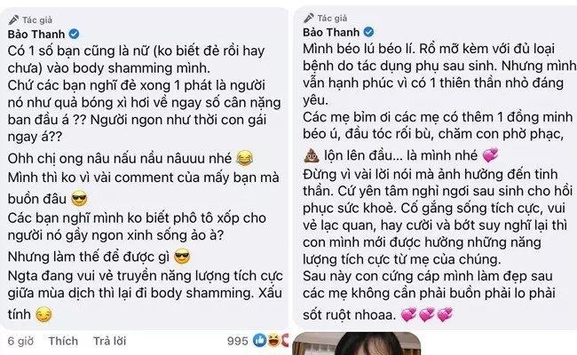 Nhận về nhiều lời chê bai ngoại hình, Bảo Thanh không buồn mà đáp trả rất đanh thép. Cô cũng luôn lan toả năng lượng tích cực đến hội mẹ bỉm trong việc yêu thương và chăm sóc bản thân.