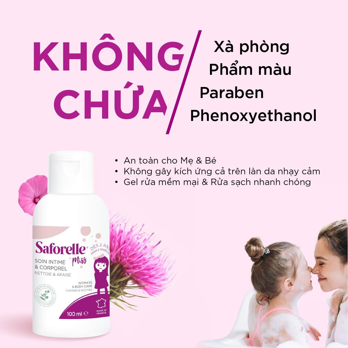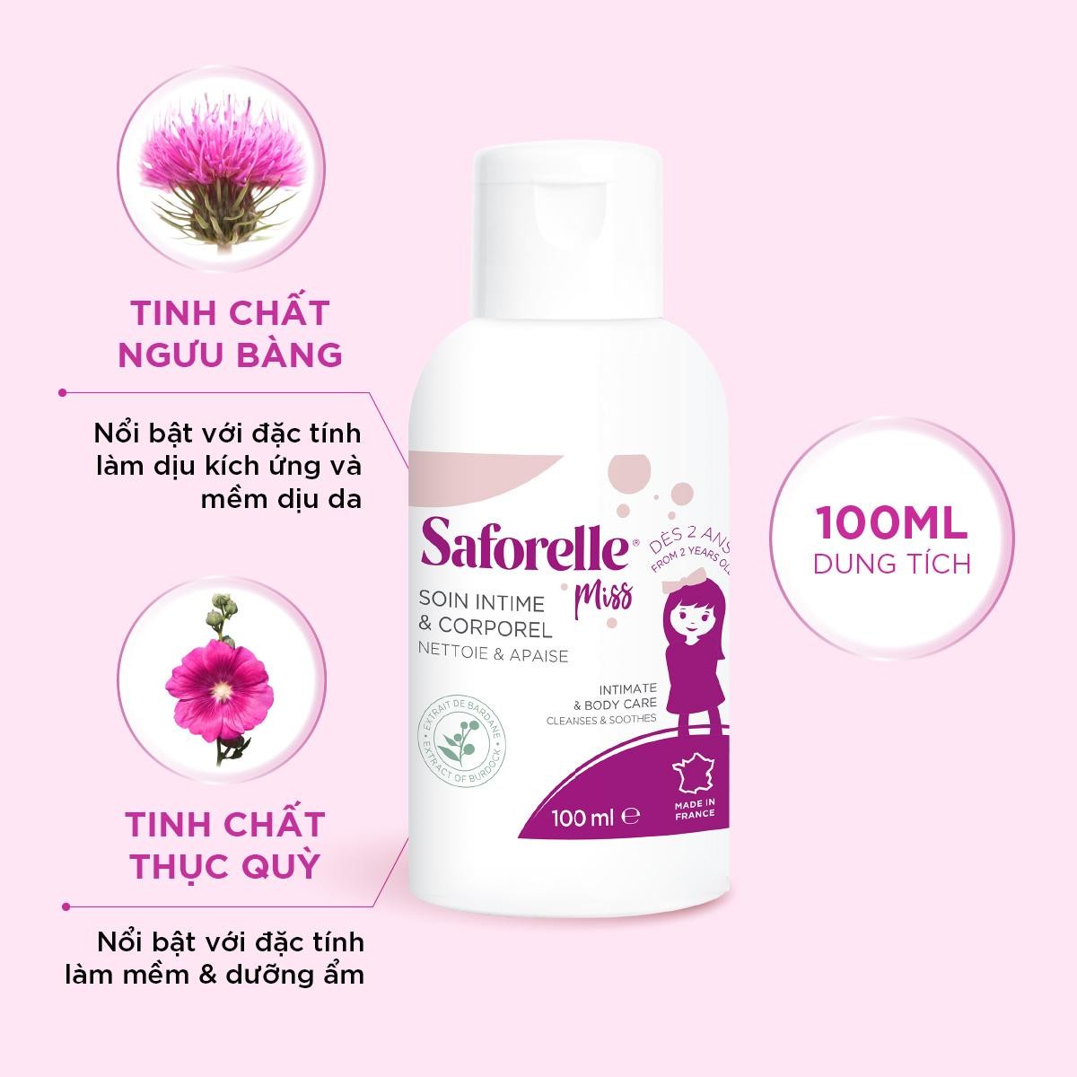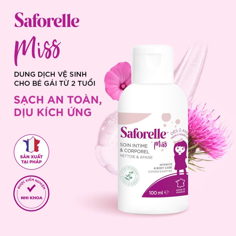 Dung dịch vệ sinh (DDVS) cho bé gái từ 2 tuổi trở lên SAFORELLE MISS được nhiều bậc phụ huynh quan tâm bởi chứa chiết xuất từ thiên nhiên là rễ cây ngưu bàng và rễ cây thục quỳ giúp làm sạch an toàn và dịu nhẹ với làn da mỏng manh của trẻ.