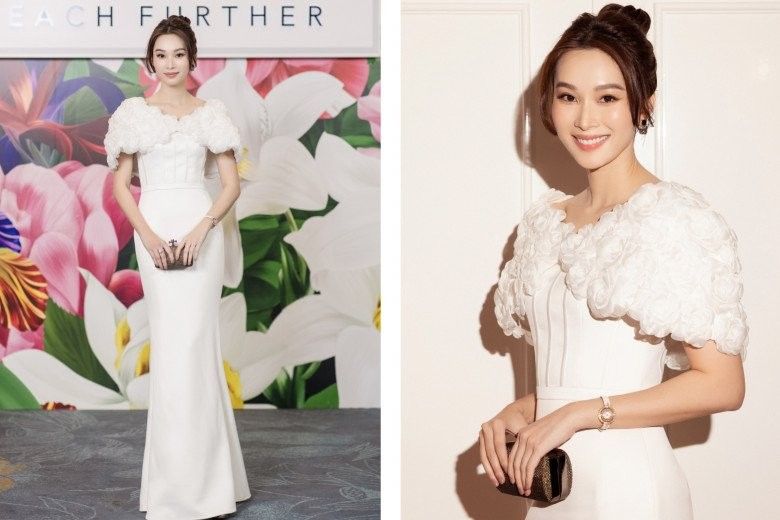 Trong một sự kiện thời trang, Đặng Thu Thảo cũng chọn cho mình một chiếc váy bodycon màu trắng. Với vóc dáng "mình hạc xương mai", body lụa là của cô được điêu khắc trọn vẹn qua kiểu dáng ôm lấy cơ thể của chiếc váy. Đặc biệt, nàng Hậu khéo chọn thiết kế có phần cầu vai như chiếc áo choàng được kết từ những bông hoa trắng xinh xắn. Trông mỹ nhân Bạc Liêu đẹp kiêu sa.